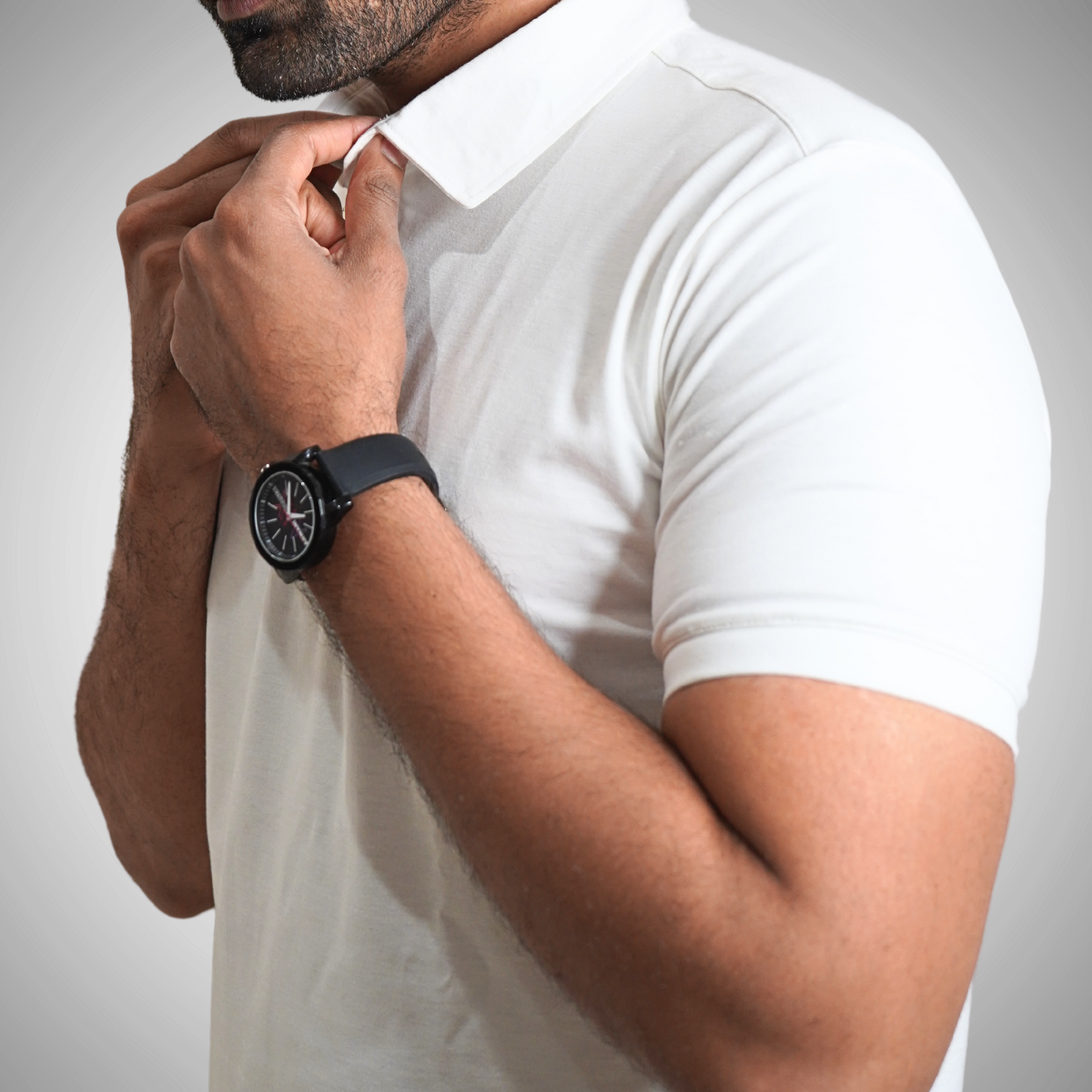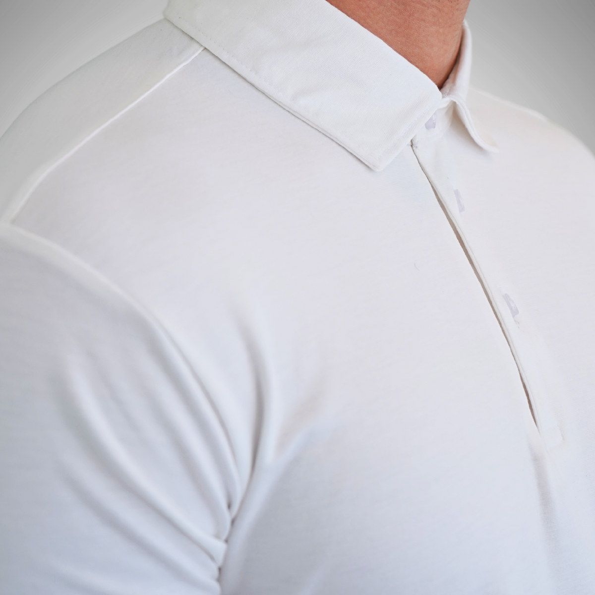 The polo collar, crafted from the same fabric as the shirt, seamlessly transitions from casual to slightly formal occasions, ensuring effortless elegance with minimal maintenance.