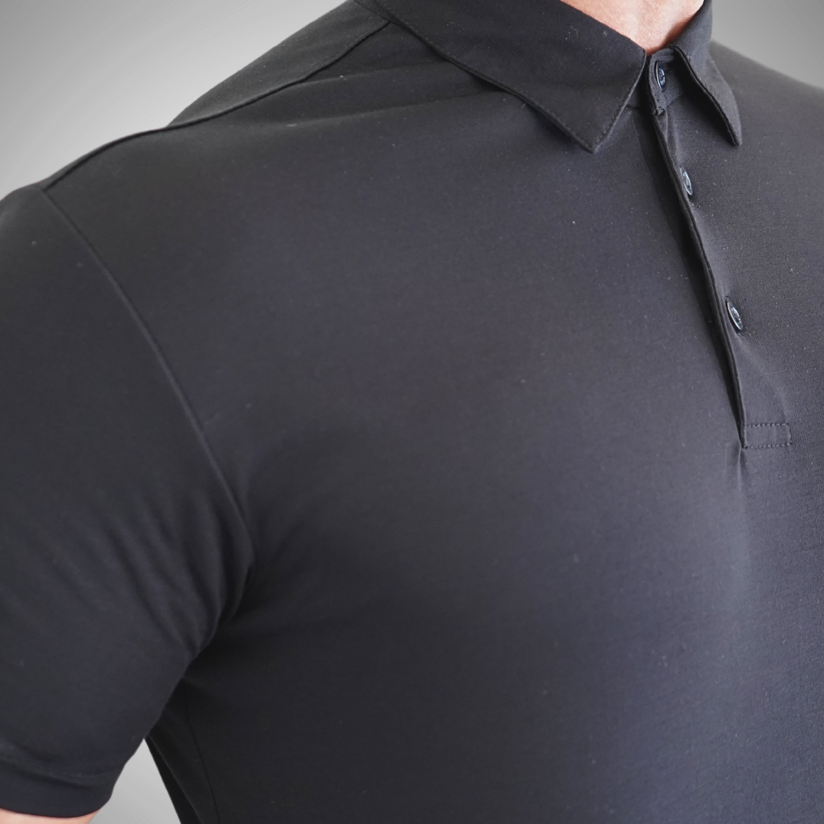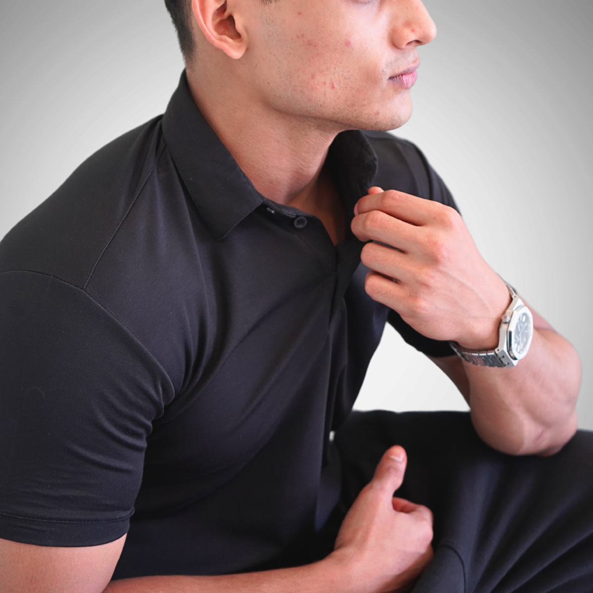 The polo collar, crafted from the same fabric as the shirt, seamlessly transitions from casual to slightly formal occasions, ensuring effortless elegance with minimal maintenance.